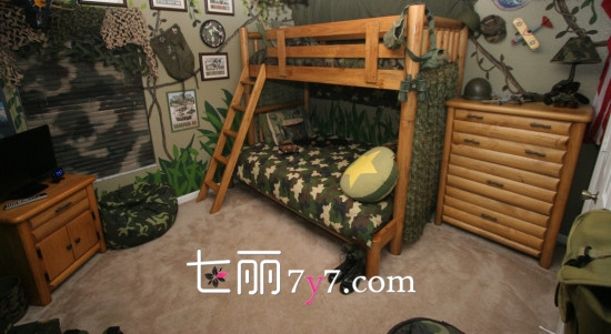 设计重点:热血人物形象,带车、球类、狙击游戏等等都是男孩子们最为忠实的朋友,将军营的迷彩融于卧室,虚拟的场景也能给孩子们最直接最真诚的保护。