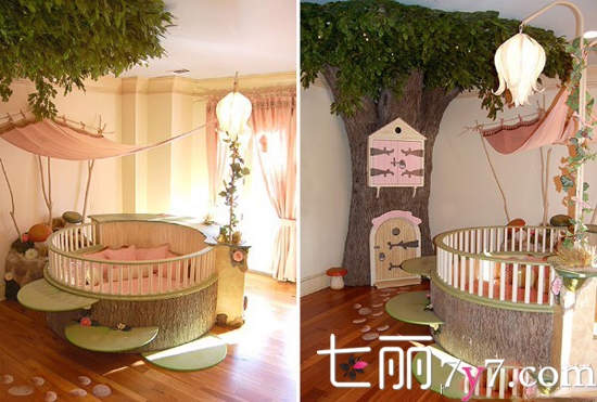 比较温馨的儿童房,来自原生态的感觉,大树设计和将床设计成树桩子的模样,教育孩子从小爱护大自然的心理,颜色也比较温暖,让孩子从小养成温柔的性格。