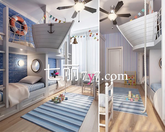 如果是男孩子可以选择海军风格的装修设计,给予孩子从小养成冒险大胆的性格,整洁的蓝白条纹装饰,干净整洁,充满了军人的正气,给孩子从小树立好的发展方向。