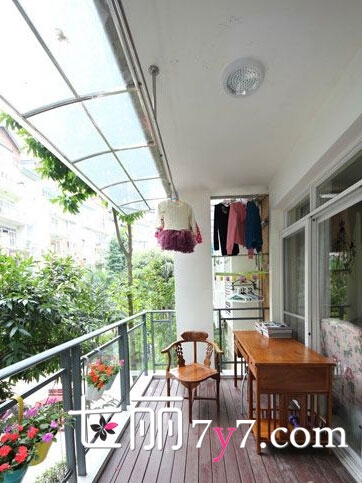 从客厅推门而出就是阳台和空中花园,木板材质的地板设计给你一种新鲜感,与颜色鲜艳的花朵形成鲜明的对比,摆上一张书桌,让你沉浸在花的海洋中。