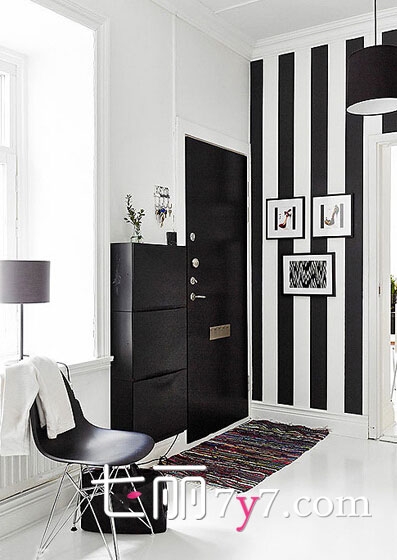 点评推荐:黑色与白色的玄关搭配,给人一种很炫酷的感觉,一侧采用了宽条纹的墙壁,给人一种时尚感。门一侧选用挂壁式鞋架,黑色的周身与整个格调相得益彰。