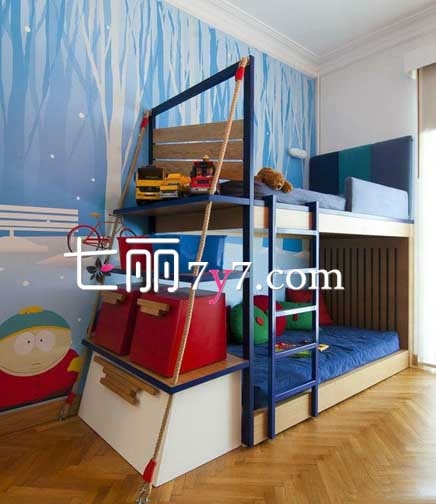 采用深蓝色、浅蓝色和白色配色,搭配原木地板看上去不会显得幼稚,又能给孩子一定的想象空间。壁纸是晚上下雪后的场景,床尾还有收纳柜设计,摆放玩具之类的最好不过了。