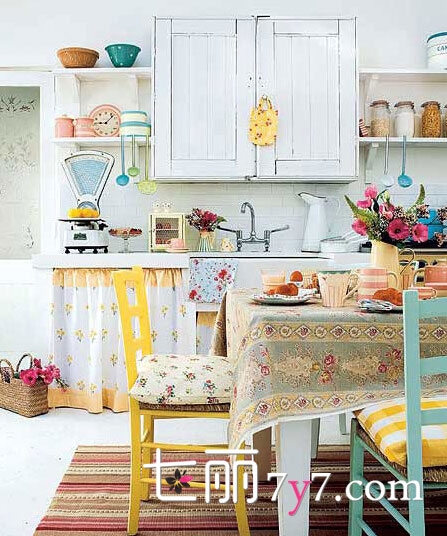 设计要点:这款厨房采用了白色做旧的橱柜作为背景,起到点缀作用的就是那些多彩的餐具和帘子、桌布、绿色植物,这样在白色的背景搭配下显得格外好看又小清新哦。