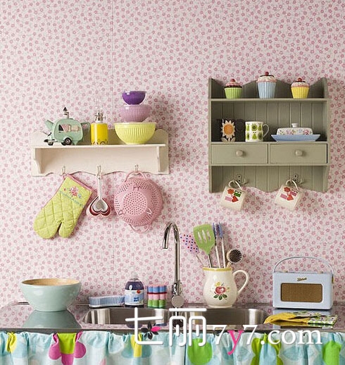 设计要点:粉色的小碎花壁纸,让厨房也能看起来粉粉嫩嫩的,再加上其他五颜六色的餐具,让你家的厨房看起来就是一个充满活力的小天地哦,还带有一种别样的温馨感。