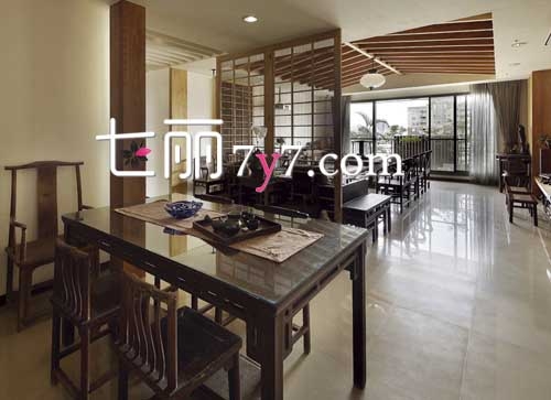 别墅怎么少得了落地窗,明朗的落地窗设计,精心的种植一些绿色植物,盎然的生机对话雅緻的竹帘屏风,让视觉养成一种亲近大自然的享受。屋梁中时尚感的古董玻璃灯装饰散发温暖的光晕,酝酿出柔和低调的气氛。中间玄关设计在规划上别具一格,巧妙的引入公共区域。