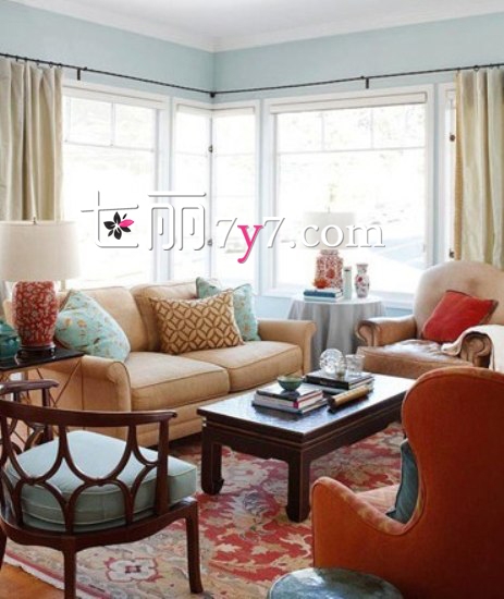 这种沙发桌椅摆放设计完全不分客厅户型,大气的红色视觉感带给人温暖的气息,再配上红色复古花案的地毯,柔美的格调会让你远离外界的喧闹,切记米色的沙发要配浅色的窗帘,这样才不会显得突兀。