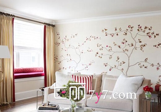 在一整幅白色的墙面上,贴上一些红色小花或者是一些代表着夏意盎然的花朵,点缀出一种小清新的感觉,以淡色系为主的空间里,白色的沙发与花朵点缀的背景墙中,能感受到非常随意又很温馨的设计感。