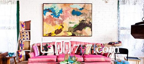 将一副抽象画悬挂在白色背景墙的中央,艳丽的桃红色沙发与白色撞墙搭配出一种后现代复古的时尚设计感,同时一种久远的年代感令人很有意犹未尽的魅力。