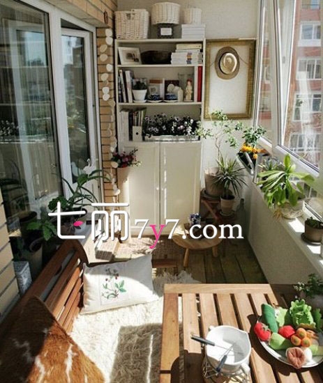 阳台的空间并不是很大,但是小设计也能十分方整,放下得一张书桌、一张长椅,长椅上的皮毛坐垫与靠包让其更为舒适,窗台上一点点的盆栽点缀,正与你一起享受这美好的一天。