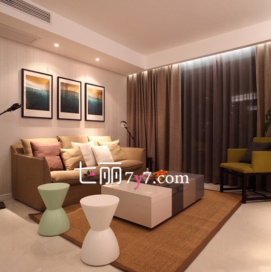现在很流行用布艺沙发,这一套不知道是卡其还是土黄色的布艺沙发,配上靠枕非常的个性,颜色比较深沉,如果搭配亮色系的窗帘,看起来会怪异。所以搭配同色系的最好了,整个风格现代、简洁、低调,在快节奏的现代城市中给予家的温馨。