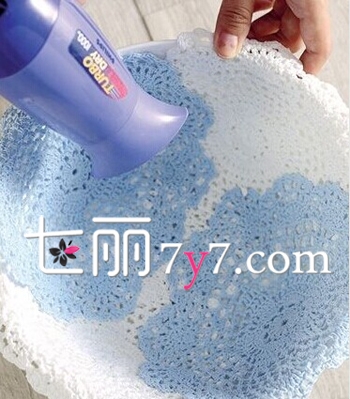 步骤四:等完全粘合好后,用吹风机对折蕾丝布吹,加速浆糊干透的速度,再蕾丝布块半干的时候,还可以果盘的周边做垂下边的心机设计,让果盘更加有造型。