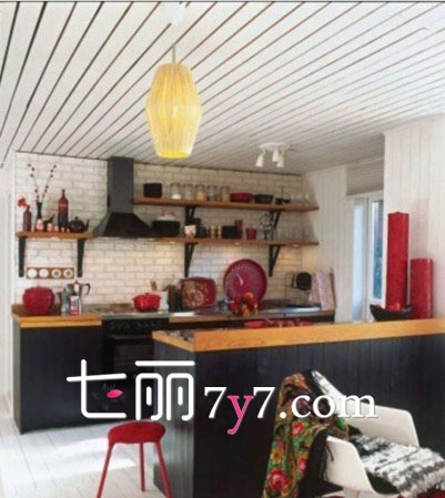 白色的木质地板和天花板,配上做旧复古的砖墙能让压抑的感觉淡然无存。头顶配上黄色吊灯设计,与黑白的橱柜衬托相呼应。这样的装修设计让空间更加的协调,在厨房里添置一些大红色的小饰品,能起到画龙点睛的效果。