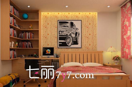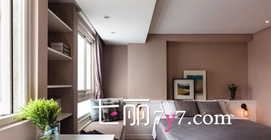 假如是不完整的卧室设计,建议可以用床边内嵌空间干脆做个整体飘窗,屋子正中央的突出墙体挖做一个小书架,小小的书房设计就诞生了!