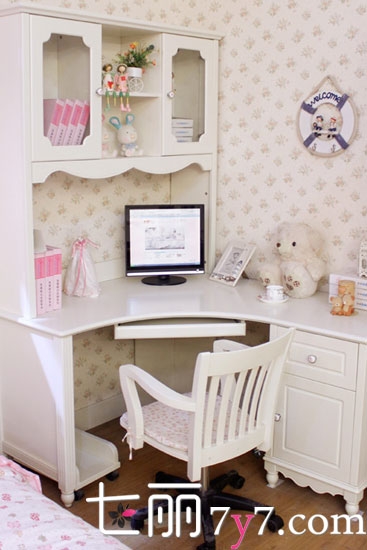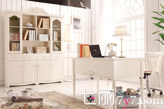 乳白色的家具在采光极好的房间中衬托的更加优雅柔美。简约的书柜与书桌采用精致美妙的雕刻设计,使家具更有韩式柔性魅力。简单的格调在细节上十分仔细出彩,让人印象深刻。