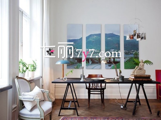 在墙面上安置隔开的风景画,来体现极简的艺术,简约的桌子,小个的单人沙发,节省出整个空间。整个房间没有多余的装饰,让人很快沉浸读书的气氛中,同时悬挂式照片能起到装饰空间的作用。