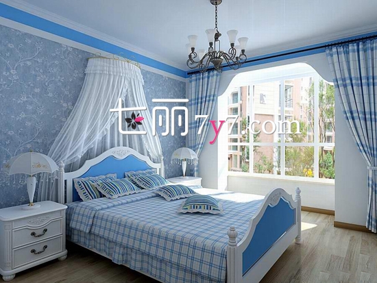 这款卧室的主打色为蓝色,打造出海洋浪漫甜美的情怀,蓝色的格纹床单,配上蓝白撞色的公主床,形成一个具有追求生活品质的人。床头板用木质墙面代替,再装饰上具有艺术感的画面,使这个空间散发着浓郁的时尚气息。
