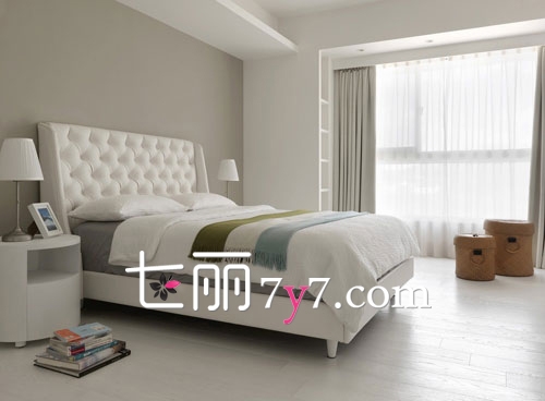 不是所有的灰白设计都显单调。这间卧室灰与白的相撞更显简约沉稳,白色皮质床头更添华丽度,弧形的床头柜呈现出趣味感。整个空间简洁大气,绝不失温馨。
