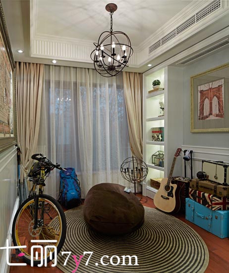 沉闷的书房你厌烦了吗?这款书房不在沉闷无朝气,一些小细节的处理上给人呈现不一样的格调,非常活力青春。地毯、自行车、吉他加入注入生机。