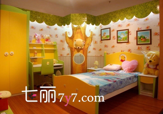 小孩都喜欢毛绒玩具,在众多卡通动漫形象中,维尼熊憨厚更加的惹小朋友喜欢,将这一元素加入到儿童房中也是不错的。深色的木质低帮,造假的壁纸,营造出树屋的感觉。让孩子光着脚丫进入到维尼熊的森林世界中。