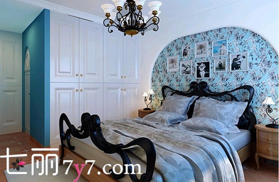 主卧设计很精美。从床到背景墙都非常有特点。背景墙的蓝色印花壁纸修饰着整间卧室,加入照片的点缀更显温馨浪漫情调。与客厅同样款式的古典吊灯让房间充斥这优雅的气息。