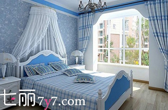 儿童房如童话般的浪漫唯美。蓝色印花墙面,白色顶棚,用大大的落地窗来扩展空间,是很不错的想法。蓝白格子窗帘带着清新美感。欧式床头柜精致不已。整个空间让人沉浸其中。