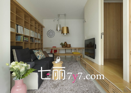 地板下的收纳电视下方以设计感格栅隐藏视听设备。简单的白色背景墙,给人一种可以推拉的感觉,这是小户型的房间,设计太过繁华会显得华而不实,这样的感觉刚好完美。