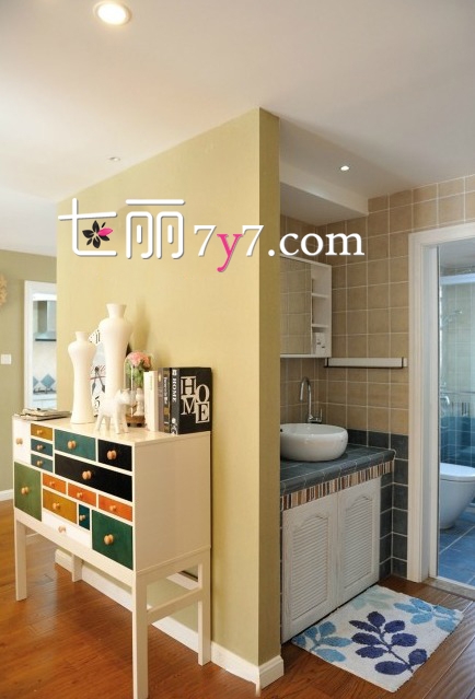 浴室:浴室的设计,木质地板截止在洗手台钱,墨绿与土黄色的贴砖很好看,玻璃门也是一种特色,浴室为了迎合整个家装的森林系风格,贴上蓝绿的瓷砖,与白色的浴池搭配也不会显得突兀。