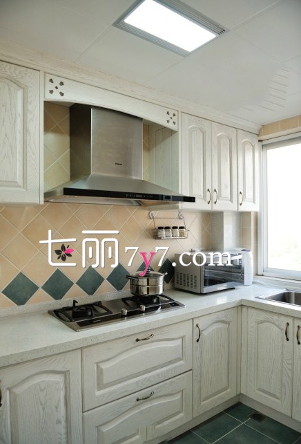 厨房:壁柜选用白色的,带着欧式的风格,墙贴瓷砖用绿色做点缀,营造出整体家装,非常好看。