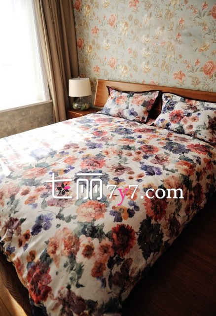 卧室:卧室就彻底走园林风格,森系的颜色都比较青翠,代表着森林,所以整个卧室木质地板加碎花墙纸,还有碎花窗帘。床上用品也用花的,很好看有没有。
