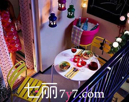 选择合适尺寸的餐桌、餐椅等家具,也可以将小小的空间也打造为餐厅。鲜明的色彩温馨浪漫,四周的挂灯让阳台成为家中最浪漫的角落。放上一些植物让空间更添自然生机,在这样的“餐厅”就餐简直美呆了。