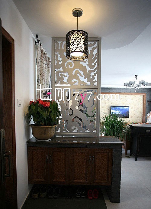 设计推荐:复古的木柜子,在过去的年代,这样的柜子彰显大富大贵的人家,如果是中式的家庭装修,这样的玄关很适合。柜子上面是带有镂空图案的屏风,形似火云又如祥云,美观之余给家带来好运。