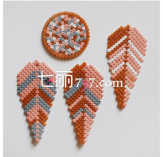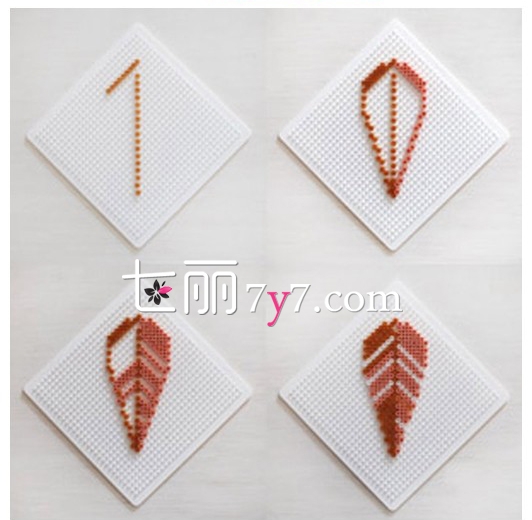第一步:先将串珠一颗颗如图所示,在塑料板子上粘成叶子的模样。然后按照个人喜好,添加不同的颜色进去,最后等固定后,用剪刀剪下来。(也可以照着图上做一模一样的,记得前后要留能够穿线的孔)。