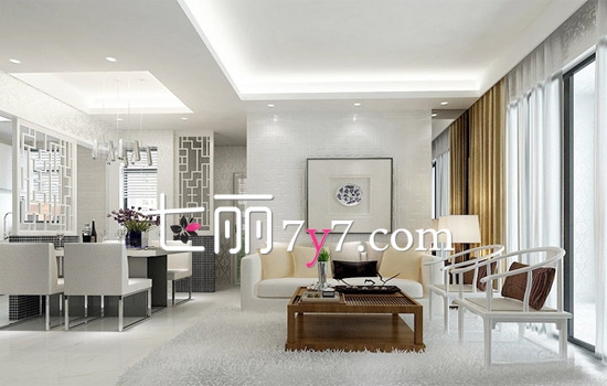 沙发背景墙用具有中国古韵的挂画点缀,简洁又大气。大大的客厅,用木质镂空装饰板规划出餐厅、休息区,变得温馨时尚。整套白色的家具,唯独凸显了原木茶几,使整间客厅看上去显得优雅又不失古典韵味。
