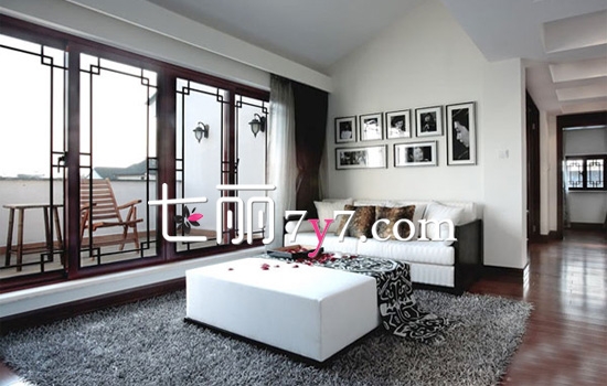 客厅连着大大的阳台,采光度极好,但难免会过于单调。用饱和度的布艺沙发与灰色的地毯,沙发的背景墙由照片组合,让空间温馨又时尚。都采用现代家具,固然还不够,阳台的门采用中式古典元素设计,呈现出一种经典时尚感。