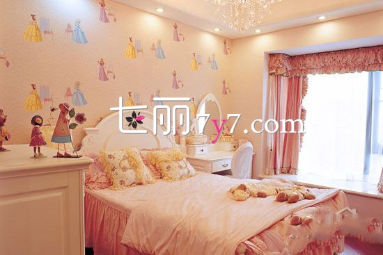 哇!粉嫩的公主房简直美腻了,MM们都有一个公主梦,即使自己没有完成也不要觉得遗憾哦,帮孩子完成也是很不错的想法。整个空间采用暖色调,粉嫩的窗帘,温馨的灯光、可爱的卡通公主墙纸,营造出一个浪漫梦幻的空间。
