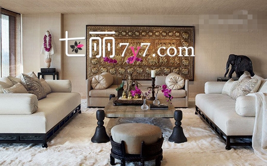 米色的墙纸配上米色的地板砖,落地窗映称白色地毯,让空间更亮。想要空间看上去更有艺术感,可以在大理石墙壁中间装修复古铜色的雕刻,呈现浓浓的考古气息,给人有学问的感觉。