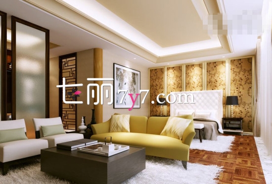 房间过道在客厅中间的家装可以这么装修,粉刷墙壁为白色,以柠檬黄色沙发作为整个空间的点缀。在有限的空间内,利用中国传统文化的经典条纹符号,整体一西方摆放设计为主。