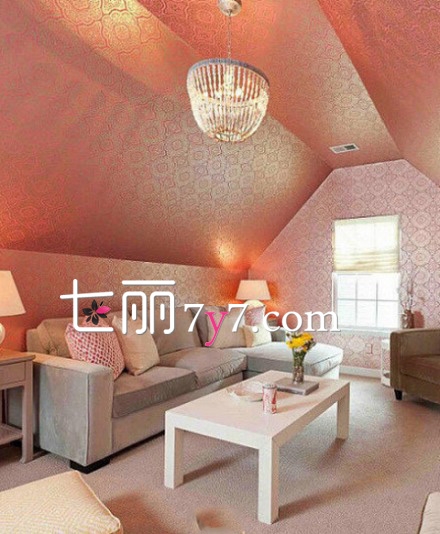 在原本基层白墙上,粘上粉色底金色花纹的墙纸,让空间看上去温馨且尊贵。想要贵气一点,可以铺上毛茸茸的地毯,然后摆放长条布艺沙发,白色的四角桌与天花板上的灯饰配对,整体感觉舒适怡人。
