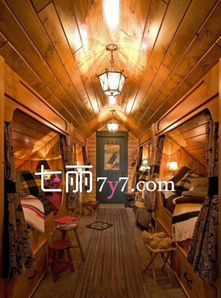 也可以学《霍比特人》的木质小屋一样设计,同款的木质横条装修整个阁楼的空间,一边设计一床榻,中间铺垫彩条灰色的地毯,暖黄色的灯照着整个空间暖洋洋的感觉。