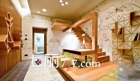 设计欣赏:可以在儿童房里设计多个有趣的细节,比如两个规则的几何图形的书架设计,还有那白色墙壁上益智的涂鸦。至于空间编排上,同样出人意料,楼梯直接通向小孩的床,这样感觉就没那么空洞了。