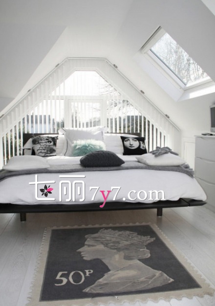设计欣赏:整个阁楼的设计清爽简约。白色和原始的木材颜色构成了主色调。床头碎花壁纸墙体以及床下的地板用木质材料,与周围纯白色的墙面、天花板、地面以及床,共同营造出特色鲜明又颇具整体感的空间效果,让住户舒适。