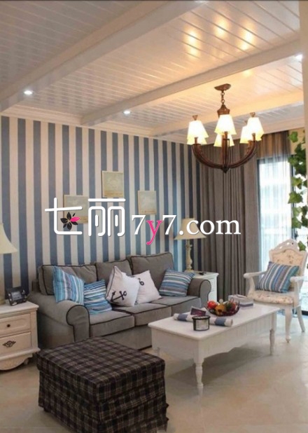 客厅蓝绿色的家具在条纹的背景墙衬托下,显得更加突出,一旁的窗帘,给人带来空气清晰阳光明媚的感觉,在墙壁的空隙还设计了隔板,既能作为收纳,又能展示,十分实用。