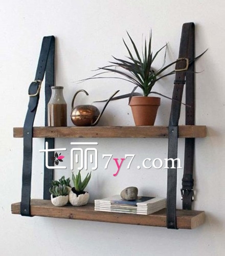 皮带的牢固性可不能小巧,过时的皮带可以如图一样,在中间隔上木板钉好,然后在固定在墙上,注意调整好比例,就成了有艺术性的置物架了。可以摆放书本或者盆栽,很好看。
