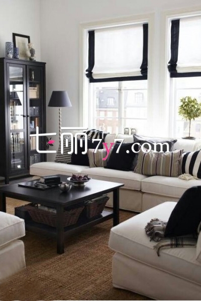 小小的客厅拥有两扇窗户,瞬间让空间变得明亮,在视觉效果上给人十分宽敞的感觉。即使实际面积并不大,但看上去还是很舒适的样子。利用黑白色系搭配出来的客厅空间总是显得如此经典。
