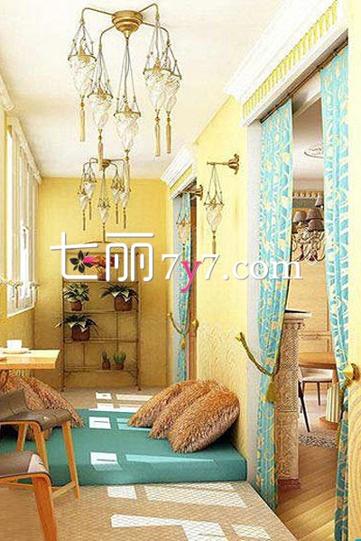 墙面被粉刷成柠檬黄色调,看上去十分清新有爱,温馨无比。搭配湖蓝色印花布艺门帘,舒适的蓝色榻榻米垫,让整个空间呈现出异域风情,无比绚丽。木质挂式小餐桌,非常精致美观,竟可能的减少空间,以保证宽敞度。