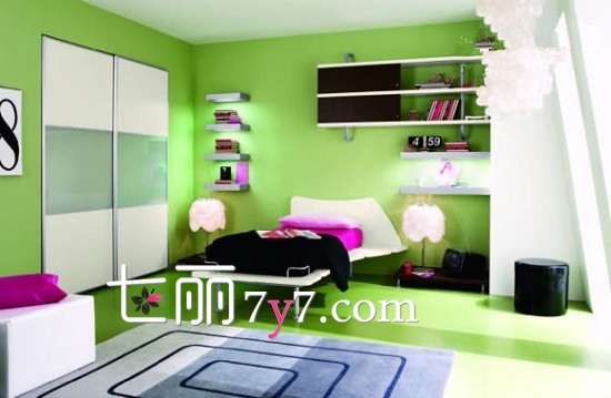 设计欣赏:整间儿童房都是用绿色,墙面和地板让房间更加靓丽,而衣柜移门上,用白绿相间的颜色,使空间看上去不单调。另外选用灰色的地毯,有黑色正方形条纹,给空间起到点睛之笔的作用。