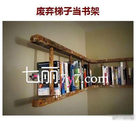 废弃的梯子当书架:相信很多人家在家居装修过程中会用到的楼梯,在家装修完成后都不知道该怎么处理,可以在空荡的某房间一角,钉在墙上当作书架来用。如若想要个性一点还能给梯子上自己喜欢的颜色。