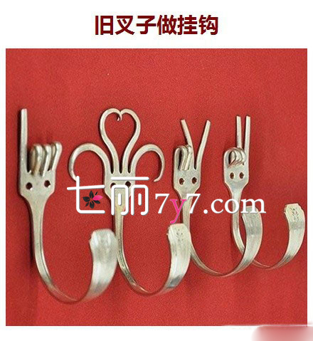 旧叉子当挂钩:每个人家都有叉子,永久以后就泛黄生旧不能用了,这个时候不用扔掉,只用把叉子手把柄的位子弯曲起来,就能当挂钩。如果想要可爱一点,可以把叉子部位弯曲成其他样子。