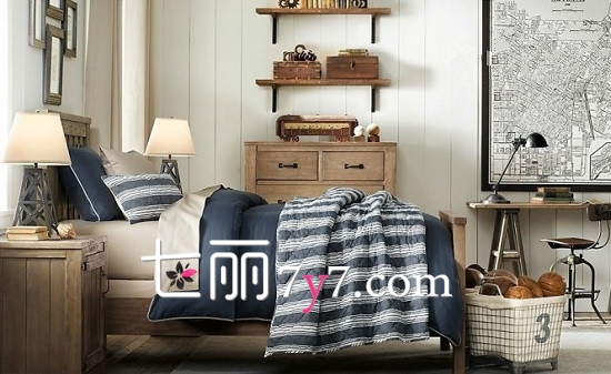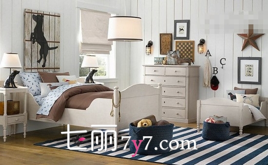 卧室装修效果图4:男孩子的卧室可以干干净净,原木风也能以白色为主,洁净的白色让空间得到净化,而地毯则选用蓝白相间条形图案,格局让人一目了然,更显青春本色。