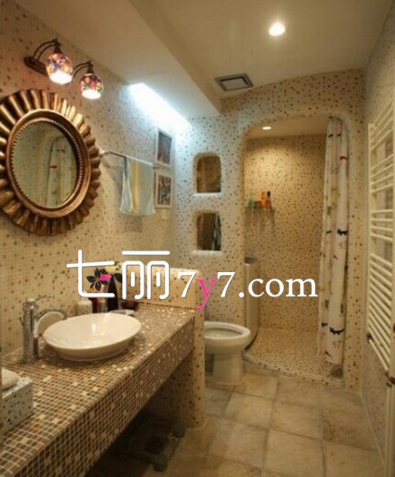 设计欣赏效果图4:米黄色的格调,迎来暧昧的气息,给人充分放松的感觉。如公主床一般的洗手台设计,在加上太阳形状的镜子,是一种乐活的反射,是年轻人不可错失的设计款式。